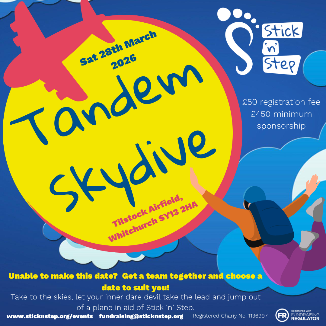 Stick ‘n’ Step receives no government funding, we rely greatly on supporters signing up to events like the Tandem Skydive. Without the bravery and courage of supporters like you signing up to these epic challenges and raising sponsorship, we would be unable to continue our vital work providing life changing support to the children and young adults that attend Stick ‘n’ Step. The sponsorship money you raise will help to fund and deliver our services to over 100 families across the North West each year.